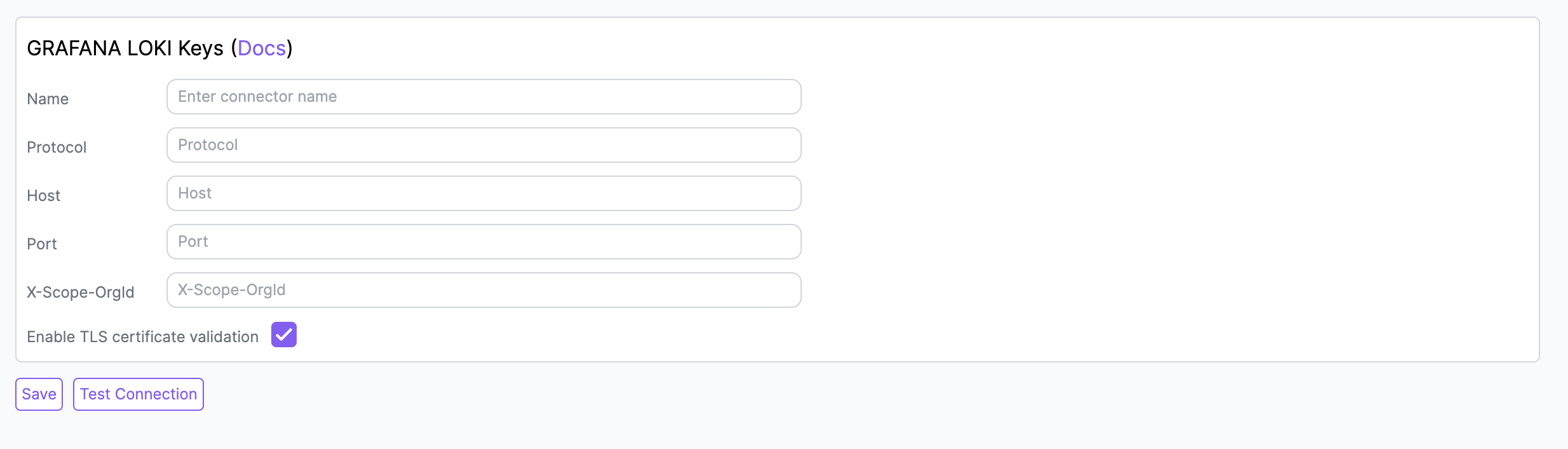 To get started with the integration, we currently support Loki integration with the following parameters: (a) Protocol (http / https) (b) Host + Port (c) X-Scope-OrgId (d) TLS Certificate Validation