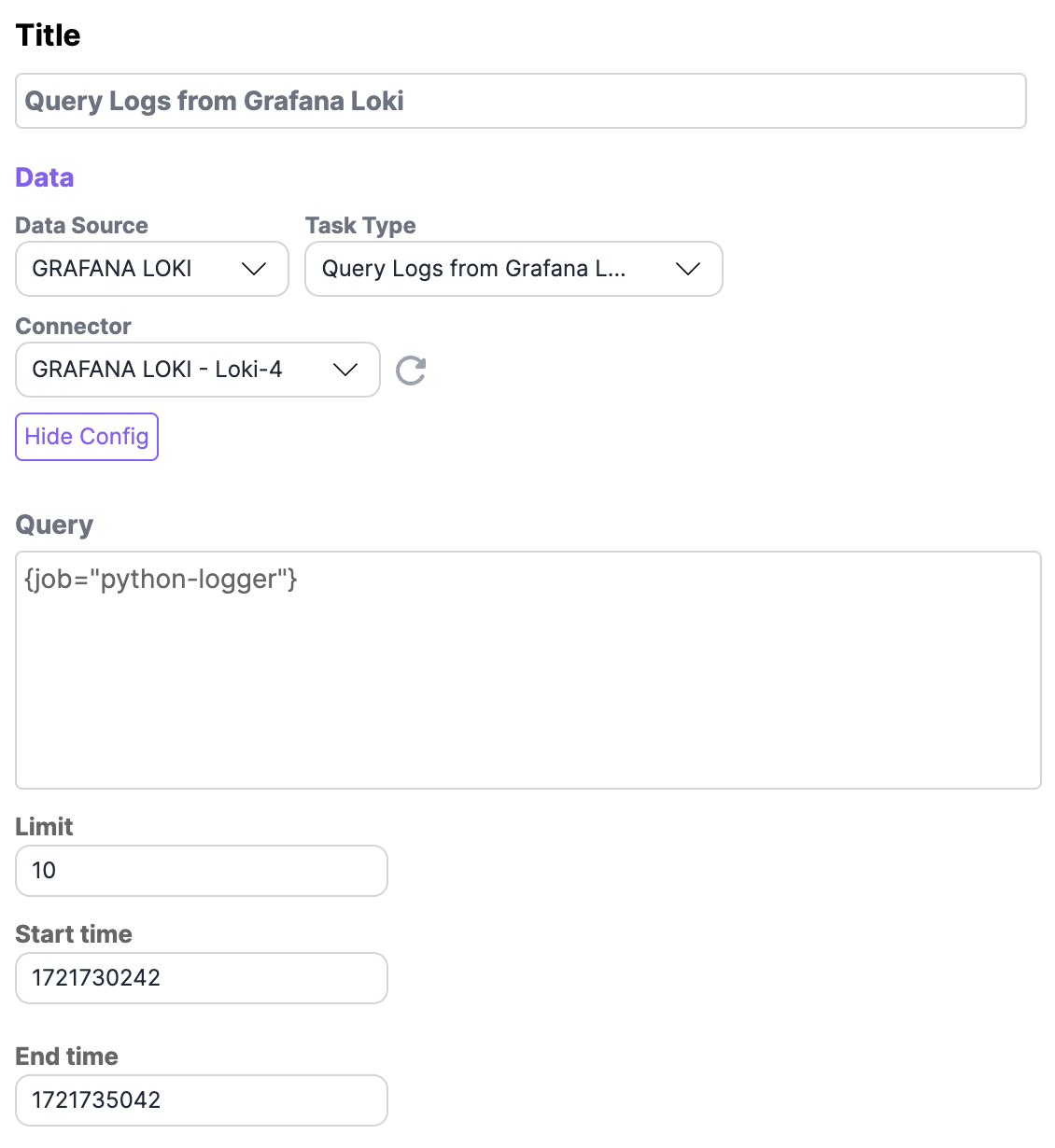 When you want to add data from Loki into a Playbook, select “Query Logs from Grafana Loki” in the Playbook.