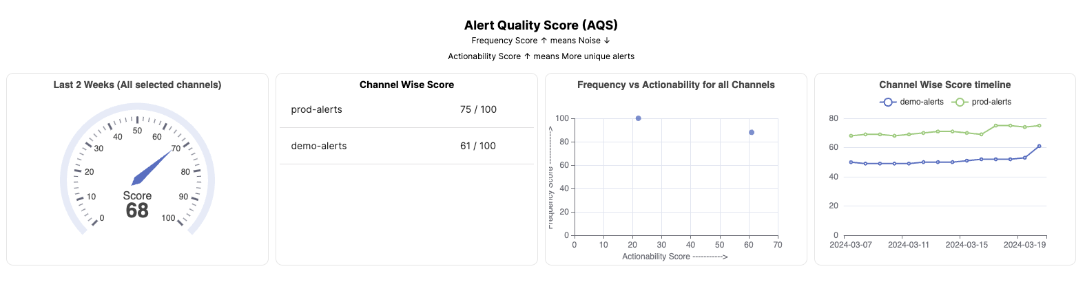 As soon as you install the bot in your channels, you will be able to track the Alert Quality Score for your channels and overall workspace.